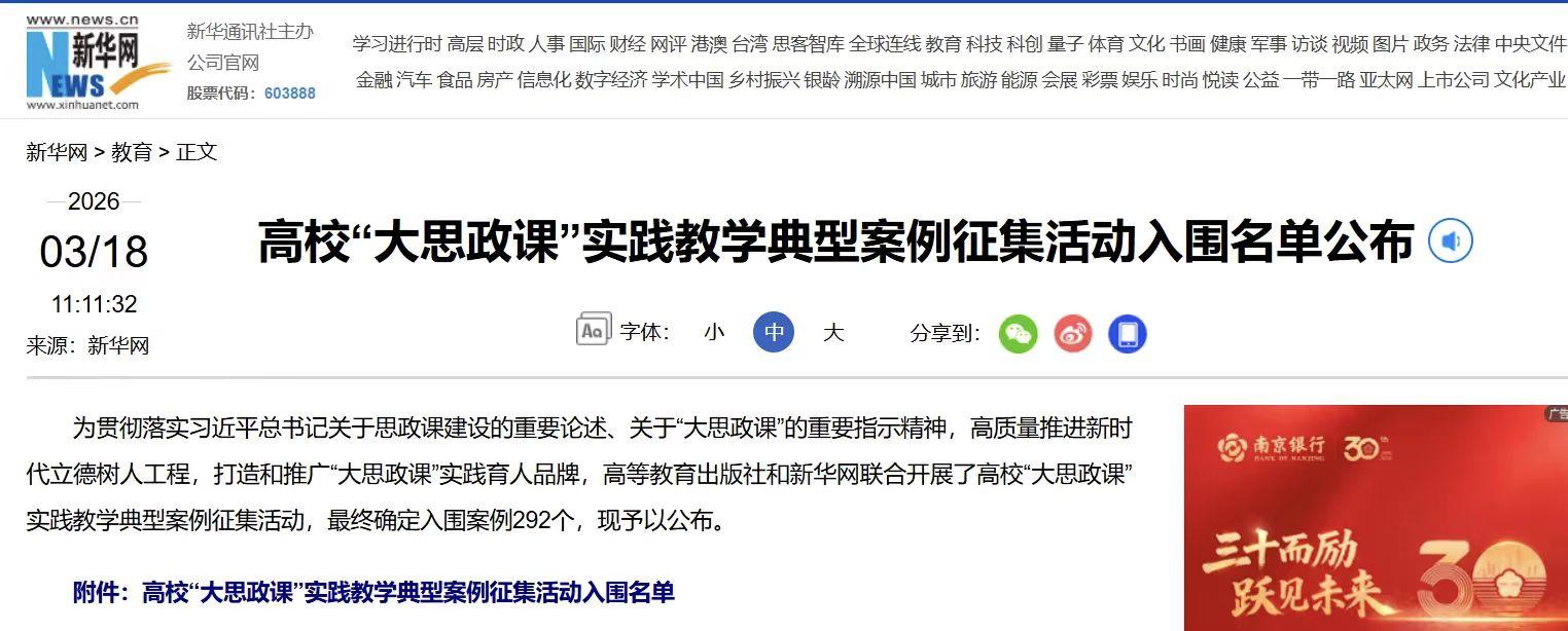 此次入围是对我校深入推进“大思政课”建设、持续深化思政课改革创新的充分肯定。学校将以此为契机,进一步发挥学科优势,推动思政教育与专业教育、创新创业教育、社会实践深度融合,不断提升立德树人实效。