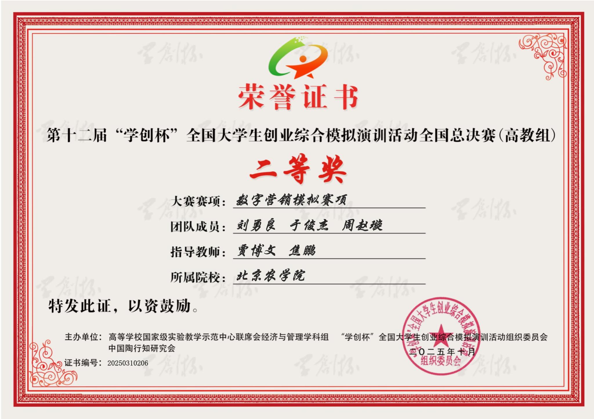 近日,第十二届“学创杯” 全国大学生创业综合模拟演训活动全国总决赛(高教组)圆满落幕。我校学子凭借扎实的专业功底、默契的团队协作与精准的决策能力,在激烈角逐中脱颖而出,最终斩获国赛创业综合赛项二等奖2 项、数字营销赛项二等奖 2 项。